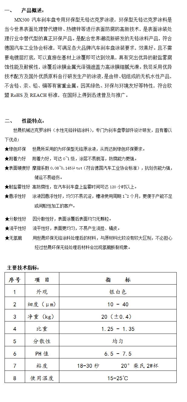 產(chǎn)品名稱(chēng):MX500汽車(chē)剎車(chē)盤(pán)專(zhuān)用環(huán)保型無(wú)鉻達(dá)克羅涂液