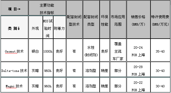 對(duì)Geomet系列、Delta-Tone系列、Magni系列三項(xiàng)無(wú)鉻技術(shù)進(jìn)行比較,Geomet無(wú)鉻涂料底涂、面涂均為水性涂料,且Geoemt技術(shù)得到國(guó)際幾乎所有主流汽車(chē)廠家的認(rèn)可,而Delta-Tone系列和Magni系列底涂為水性涂料,但面涂仍為有機(jī)溶劑型涂料,只是僅被部分廠商認(rèn)可。